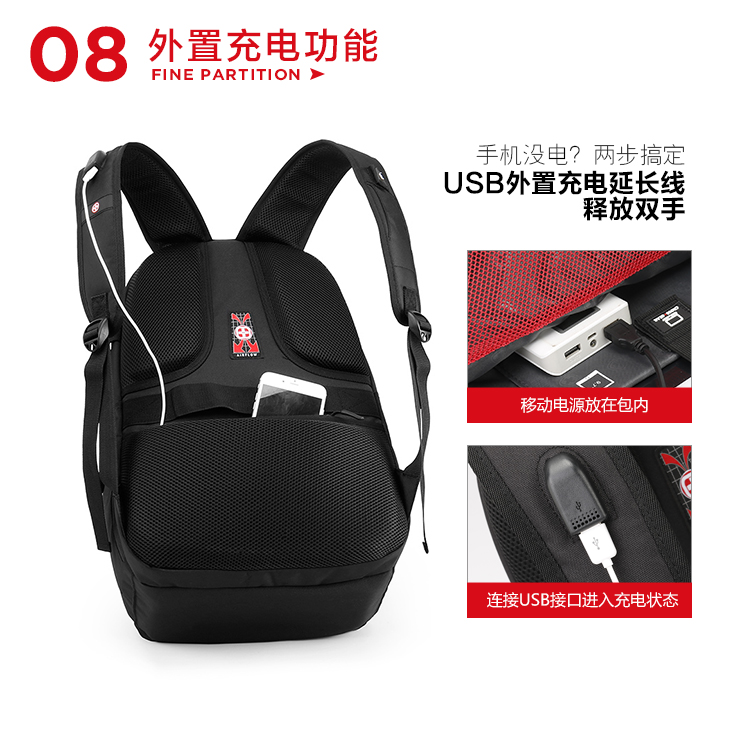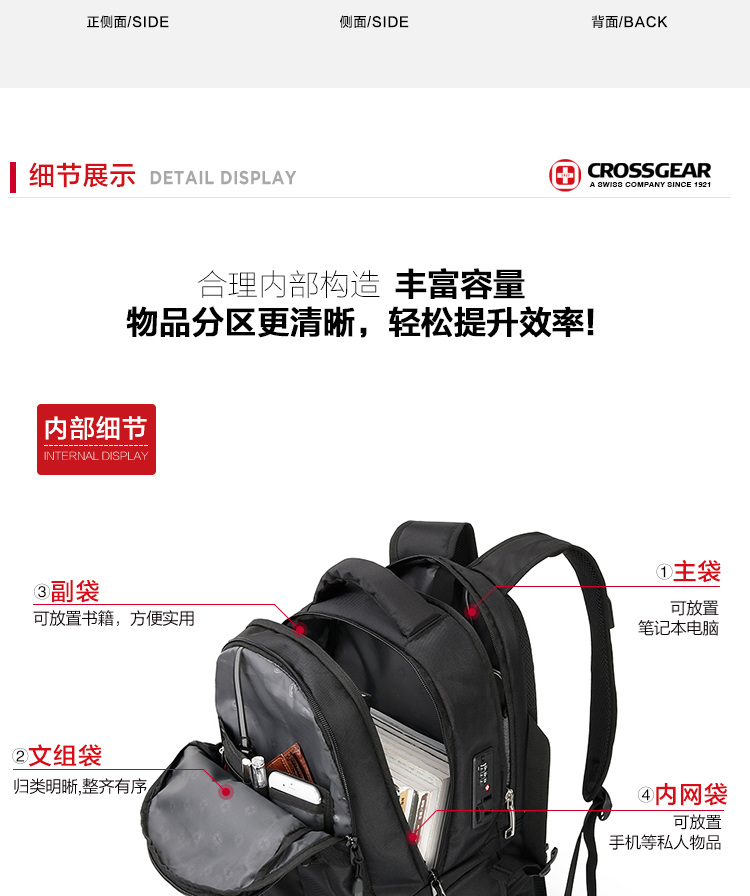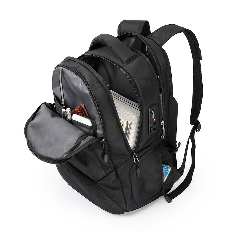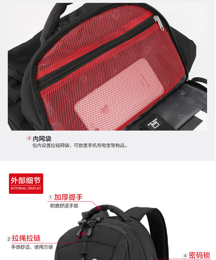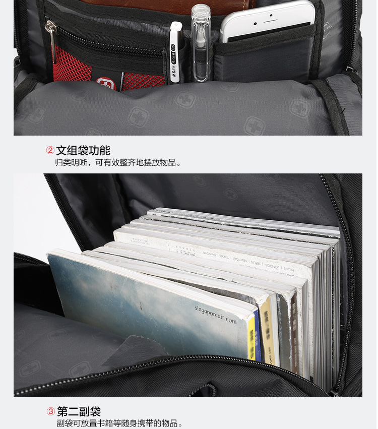 One front pocket,one mesh zipper pocket,Two pencil pockets,One small pocket,One book pocket,One key chain,earphone hole。computer compartment 15.6 inch ,iPad:9.7 inch.