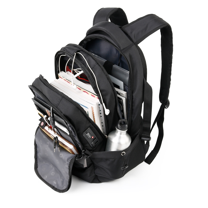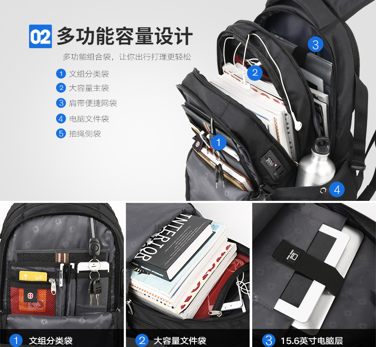 2:One zipper mesh pocket,computer compartment 15.6 inch ,Two side pockets;